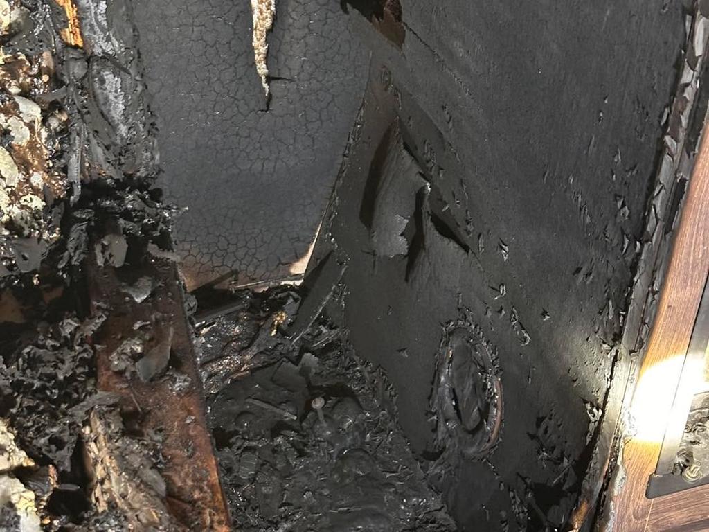 The owner reported that the last time he closed the door the inside was normal and at times over the last 24 hours he smelled smoke but he never noticed anything out of the ordinary. The cause of the fire is unknown and is an example of a vent limited fire that ran out of oxygen and put itself out.